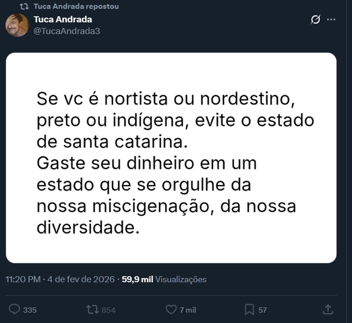 “Como é que tu fala uma besteira dessas?”; Guidi responde ator que pediu para nordestinos e pretos não visitarem SC 6 de fevereiro de 2026