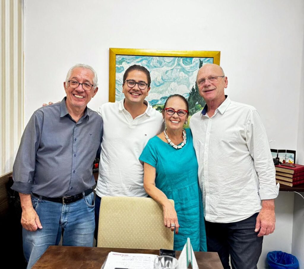 Por falar no Manda Brasa, o vereador criciumense Marcos Machado vem recebendo apoio da velha guarda emedebista, que quer vê-lo deputado federal. Na foto, Marquinho Machado está ao lado do ex-prefeito de Criciúma, Paulo Meller; da ex-deputada estadual Ada De Luca; e do ex-deputado federal Ronaldo Benedet, que parece bastante determinado a recuperar os votos na sigla, desta vez destinando-os ao jovem da imagem.