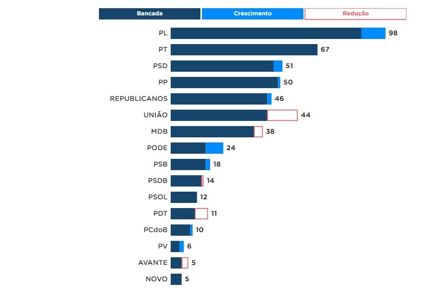 Na Assembleia Legislativa, também ocorreram mudanças na composição das bancadas. O PL saltou de 11 para 14 deputados, mais que o dobro da segunda bancada, formada pelo MDB, com 6 parlamentares. As bancadas estaduais ficaram assim: