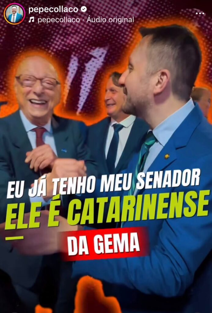 Na última semana, após o anúncio de que a chapa do governador ao Senado será composta por Carlos Bolsonaro e Carol de Toni, os progressistas têm se mobilizado nas redes sociais para demonstrar apoio a Esperidião. Publicações como essa foram vistas durante todo o fim de semana, ressaltando que o candidato do PP é “catarinense da gema”.